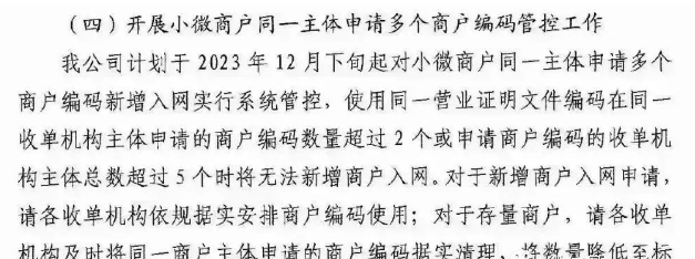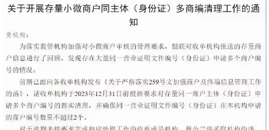 前期已面向各收单机构发布《关于严格落实259号文加强商户及终端信息管理工作的函》,请收单机构于2023年12月31日前根据要求对存量同一商户主体(身份证)申请多个商户编号的据实清理,并确保同一营业证明文件编号(身份证)在本机构申请的商户编号数量不超过2个。